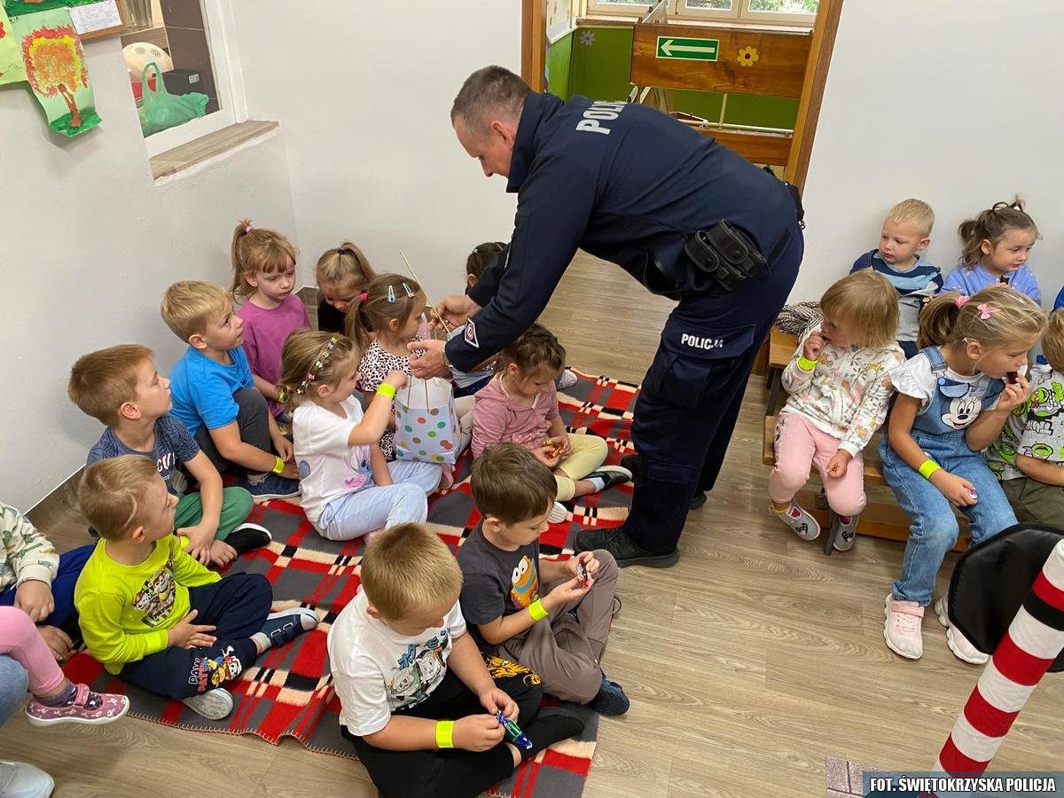 Dziś dzielnicowy z Wydziału Prewencji oraz policjanta z Wydziału Ruchu Drogowego Komendy Powiatowej Policji w Końskich odwiedzili dzieci z Publicznego Przedszkola nr 3 w Końskich. Działania zostały zorganizowane w ramach ogólnopolskiej akcji „ Bezpieczna droga do szkoły”, gdzie policjanci przeprowadzili zajęcia profilaktyczne na temat szeroko rozumianego bezpieczeństwa. Mundurowi omówili z dziećmi podstawowe znaki drogowe, a także przypomnieli jak ważną rolę spełniają elementy odblaskowe. Najmłodsi, przy wykorzystaniu miasteczka ruchu drogowego, mogli przypomnieć sobie zasady bezpiecznego poruszania się po drodze. Policjanci podczas spotkania przybliżyli także tematykę związaną z bezpieczeństwem w domu, a także ostrzegali przed kontaktami z nieznajomymi osobami. Na zakończenie spotkania dzieci otrzymały od policjantów elementy odblaskowe.
