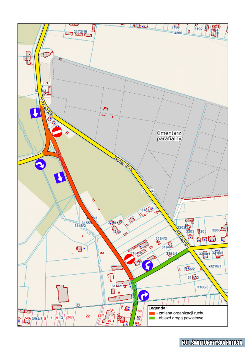 W dniach od 31.10.2025r do 02.11.2025r w rejonie cmentarza w m. Czarna gm. Stąporków znajdującego się po obu stronach drogi, po lewej stronie zostanie wprowadzony zakaz zatrzymywania się.