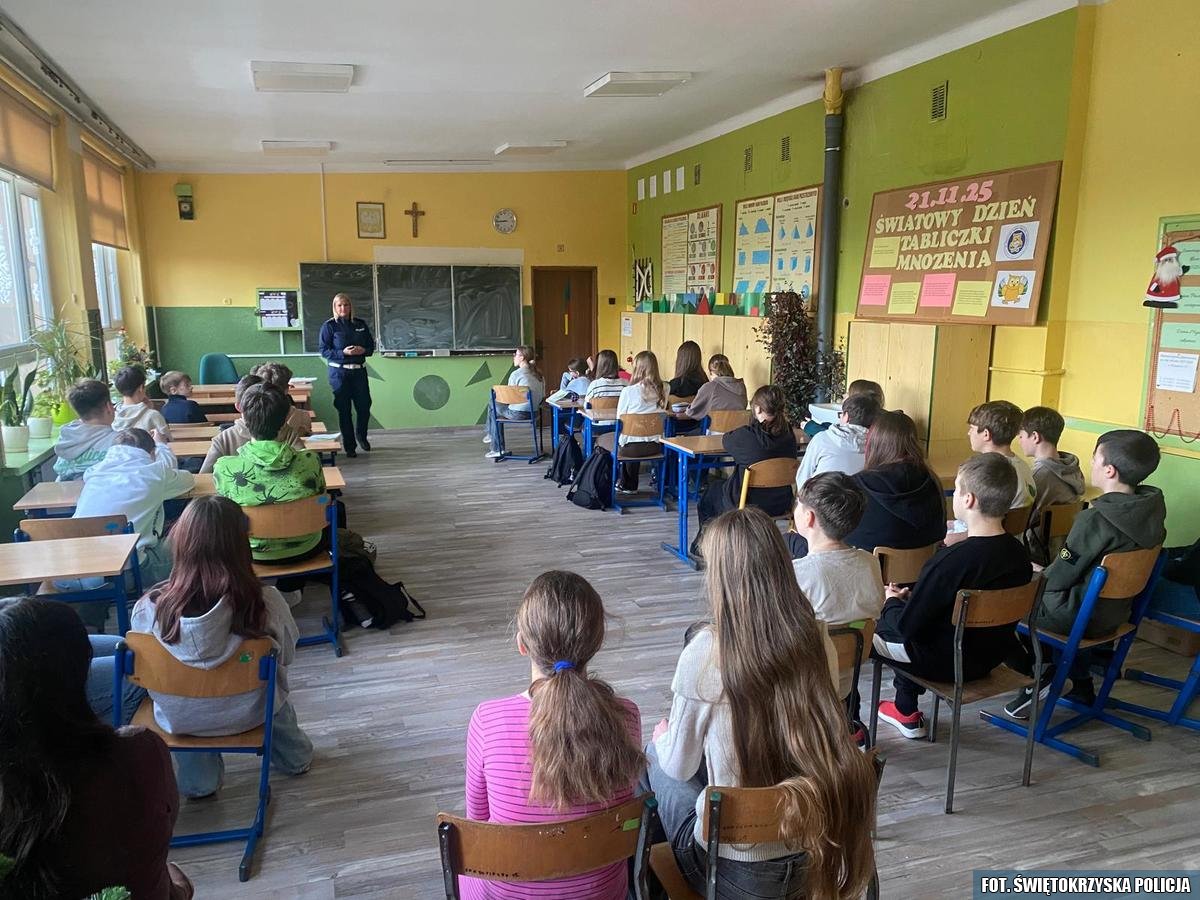 Policjantka z Wydziału Ruchu Drogowego Komendy Powiatowej Policji w Końskich, w ramach akcji informacyjno-edukacyjnej skierowanej do pieszych pn. „Świeć Przykładem – Noś odblaski”, przeprowadziła spotkania profilaktyczne w Szkole Podstawowej w Królewcu oraz Zespole Placówek Oświatowych w Nieświniu na temat szeroko pojętego bezpieczeństwa.