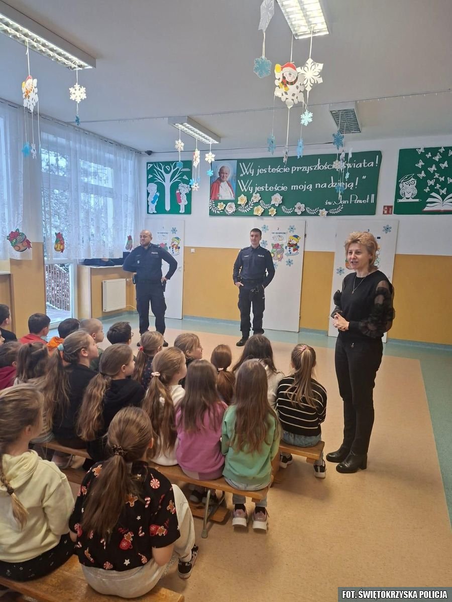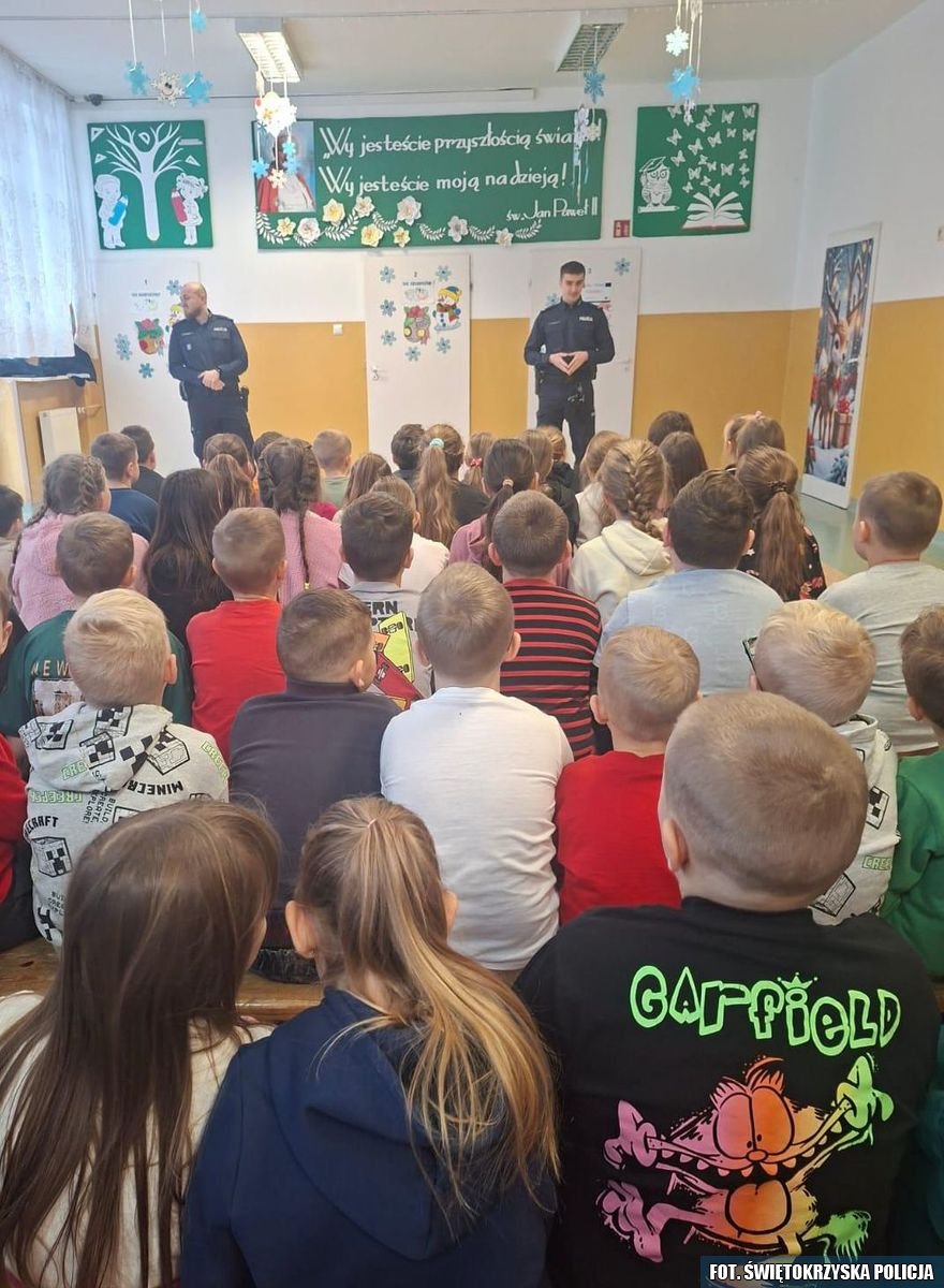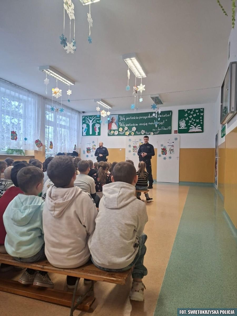 Polcijanci z Wydziału Prewencji Komendy Powiatowej Policji w Końskich w ramach działań profilaktyczno - edukacyjnych „Bezpieczne Ferie” i „Kręci mnie bezpieczeństwo w zimie” odwiedzili dzieci ze Szkoły Podstawowej w Gowarczowie oraz Prywatnej Szkoły Podstawowej w Końskich . Jak co roku, mundurowi przypominają dzieciom o podstawowych zasadach bezpieczeństwa podczas zimowego wypoczynku. Policjanci przypomnieli również, jakich niebezpiecznych zachowań należy unikać, aby nie doszło do wypadku oraz jak bezpiecznie można spędzać czas zimą w domu i na świeżym powietrzu. Nie zabrakło także rozmów na temat bezpieczeństwa w ruchu drogowym. Policjanci uświadomili młodym słuchaczom, jak ważną rolę spełniają odblaski podczas poruszania się po drogach.