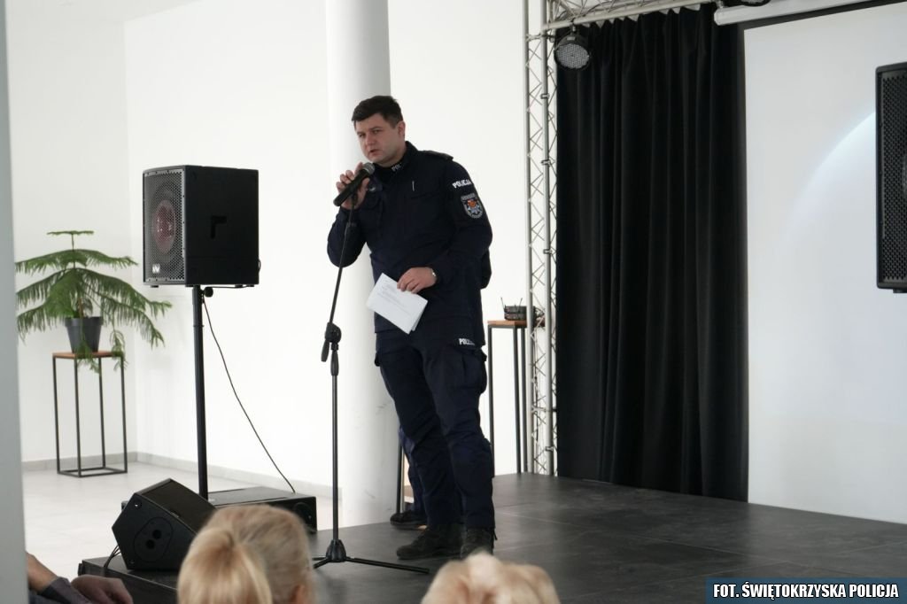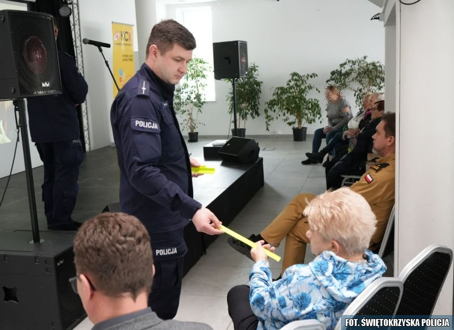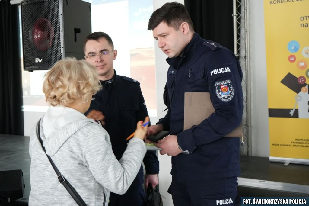 Dziś w budynku Koneckiego Centrum Kultury mł.asp. Krzysztof Bernat z Zespołu Profilaktyki i Organizacji Służby Wydziału Prewencji Komendy Powiatowej Policji w Końskich wspólnie z st. sierż. Kamilem Dudkiem z Zarządu w Kielcach Centralnego Biura Zwalczania Cyberprzestępczości, przeprowadzili z seniorami spotkanie profilaktyczne, którego tematem przewodnim było szeroko rozumiane bezpieczeństwo w tym w sieci, a także przybliżenie sposobu działania oszustów internetowych. Podczas spotkania policjanci przekazali seniorom cenne rady dotyczące bezpieczeństwa w sieci, oraz przybliżyli sposób działania oszustów internetowych. Poruszono również najistotniejsze tematy związane z cyberbezpieczeństwem osób starszych. Ponadto policjanci omówili jak przeciwdziałać oszustwom na „wnuczka”, czy też „na policjanta”. Policjanci przestrzegali, aby być ostrożnym w kontaktach z nieznajomymi w sieci i nie przekazywać im żadnych pieniędzy, kodów BLIK, czy też danych osobowych lub numerów kart kredytowych. Ponadto funkcjonariusze przekazali mieszkańcom kilka kluczowych wskazówek, dzięki którym mogą zapobiec przykrym zdarzeniom. W ramach Dnia Bezpiecznego internetu, który obchodziliśmy w dniu wczorajszym funkcjonariusze przestrzegali przed nieodpowiedzialnym umieszczaniem filmików, własnych zdjęć, komentarzy czy prowadzeniem korespondencji i spotykaniem się z osobami poznanymi w wirtualnej przestrzeni. Policjanci zwrócili również uwagę na to, że korzystając z Internetu nie należy nikogo hejtować oraz propagować tam mowy nienawiści, gdyż takie zachowanie może kogoś skrzywdzić oraz jest zabronione. Podczas spotkania policjant wręczał również elementy odblaskowe.