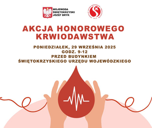 W poniedziałek 29 września, przed Świętokrzyskim Urzędem Wojewódzkim odbędzie się akcja honorowego oddawania krwi. Specjalnie przygotowany krwiobus będzie czekał na chętnych już od godziny 9:00, cenny dar będzie można oddać do godziny 12:00. Serdecznie zapraszamy!